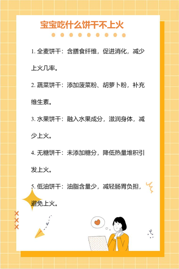 宝宝吃全麦饼干、蔬菜饼干、水果饼干、无糖饼干、低油饼干等不上火。