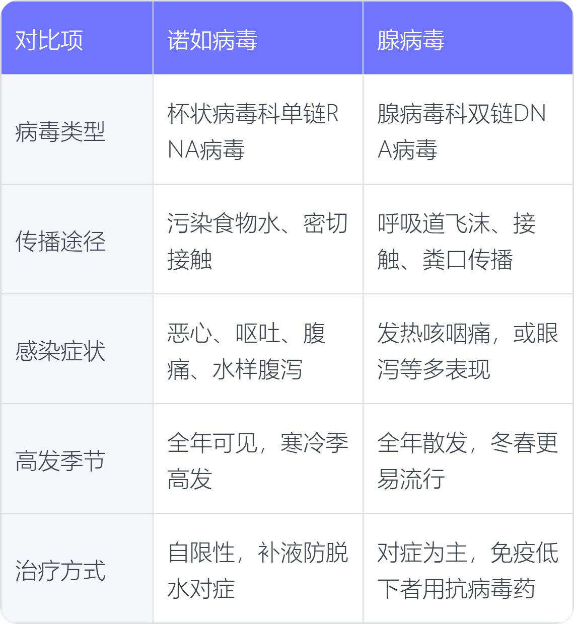 诺如病毒与腺病毒在病毒类型、传播途径、感染症状、高发季节、治疗方式等方面上存在不同。