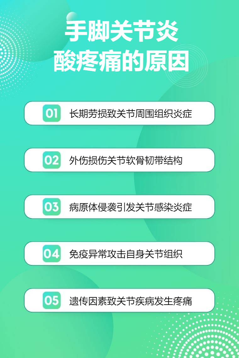 1. 劳损:长期过度使用手脚进行重复性动作,如频繁打字、手工劳作等,会使关节周围肌肉、韧带等软组织疲劳受损,引发炎症,导致酸疼痛。减少手部活动量,适当休息,可通过热敷、按摩等促进血液循环,缓解不适。