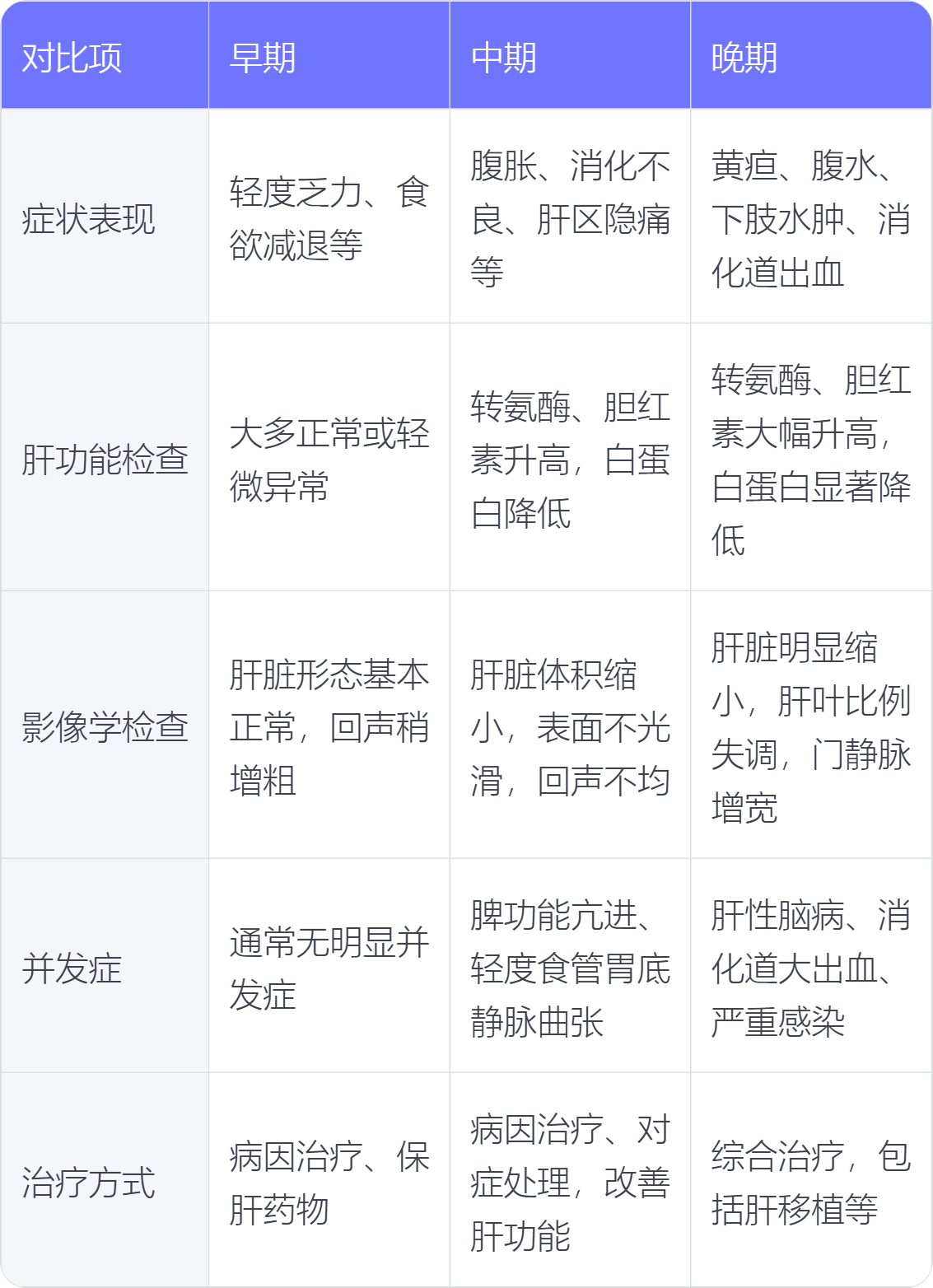 1. 症状表现:早期症状多不明显,可能仅有轻度乏力、食欲减退等;中期症状逐渐加重,会有腹胀、消化不良、肝区隐痛等;晚期症状严重,出现黄疸、腹水、下肢水肿、消化道出血等。