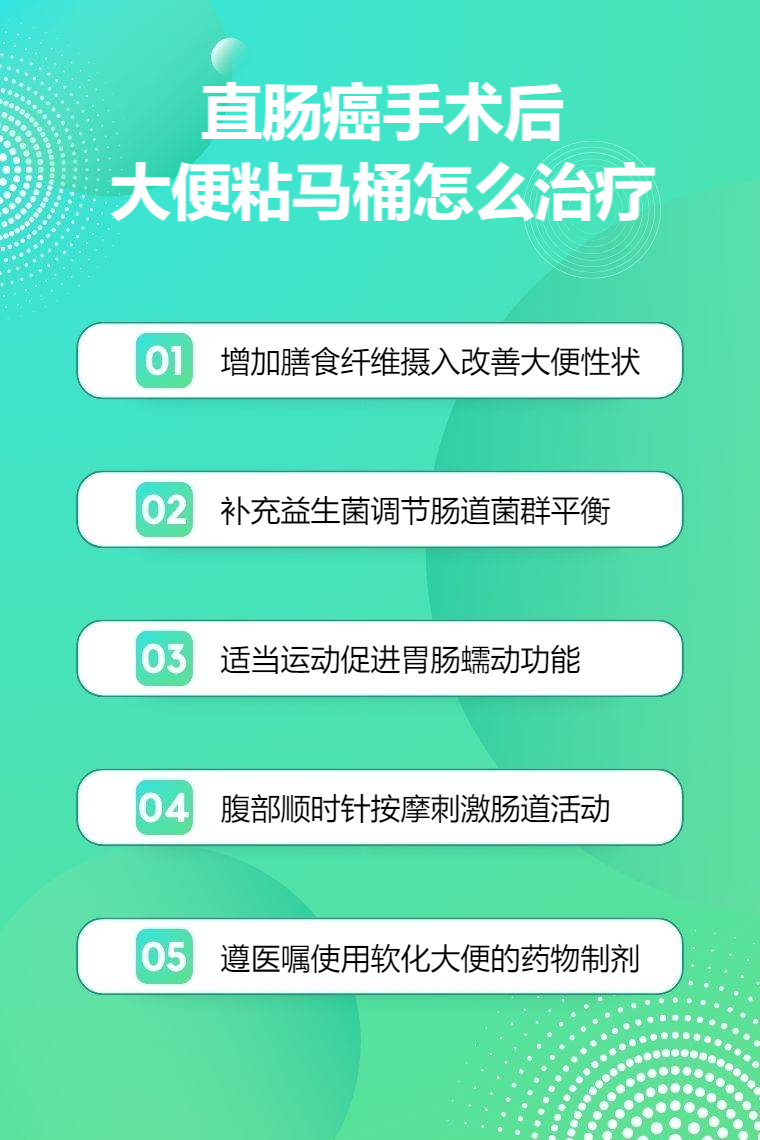 直肠癌手术后大便粘马桶可通过饮食调整、补充益生菌、适当运动、腹部按摩、药物治疗等方法改善。