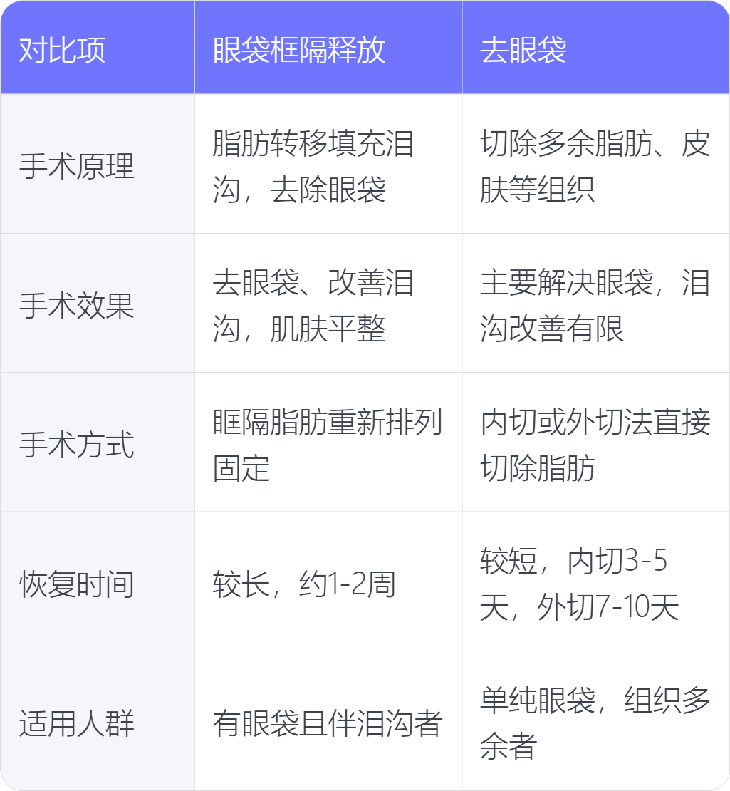 2. 手术效果:眼袋框隔释放不仅能去除眼袋,还能改善泪沟问题,使眼部下方肌肤更加平整;单纯去眼袋手术主要解决眼袋突出问题,对泪沟改善不明显。