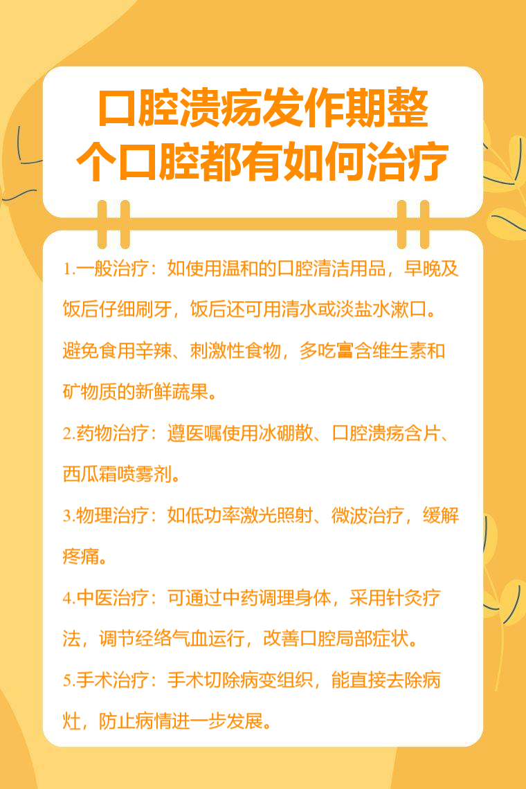 口腔溃疡发作期整个口腔都有的治疗方法包括一般治疗、药物治疗、物理治疗、中医治疗、手术治疗等。
