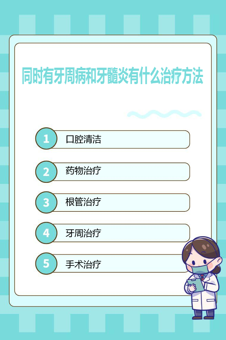同时有牙周病和牙髓炎的治疗方法有口腔清洁、药物治疗、根管治疗、牙周治疗、手术治疗等。