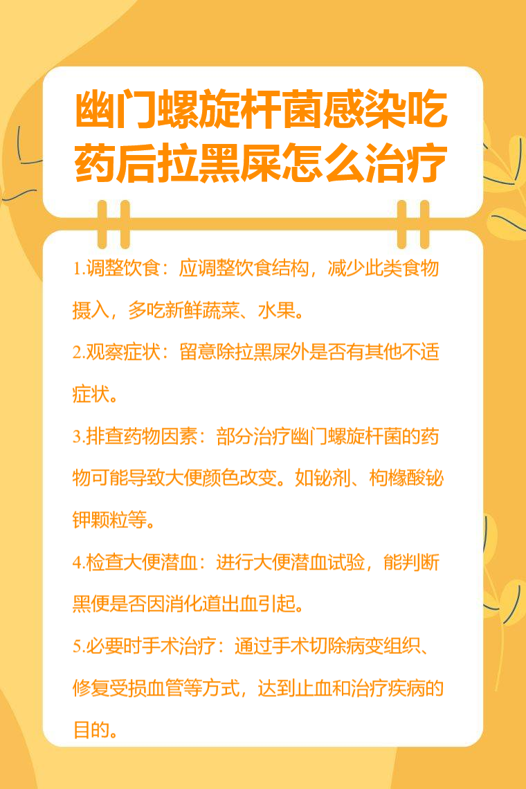 幽门螺旋杆菌感染吃药后拉黑屎可通过调整饮食、观察症状、排查药物因素、检查大便潜血、必要时手术治疗等方法处理。