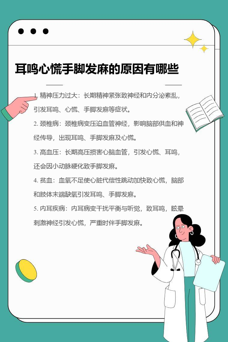 耳鸣心慌手脚发麻的原因有精神压力过大、颈椎病、高血压、贫血、内耳疾病等。