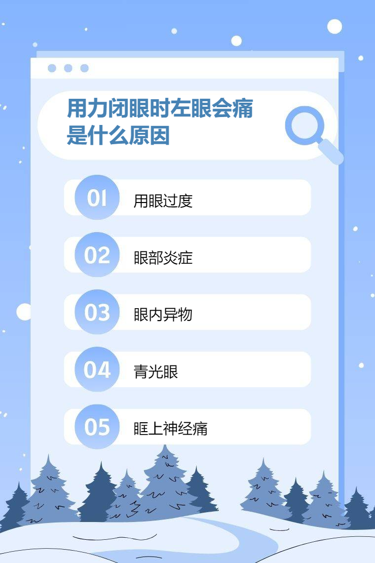 用力闭眼时左眼会痛可能是用眼过度、眼部炎症、眼内异物、青光眼、眶上神经痛等。