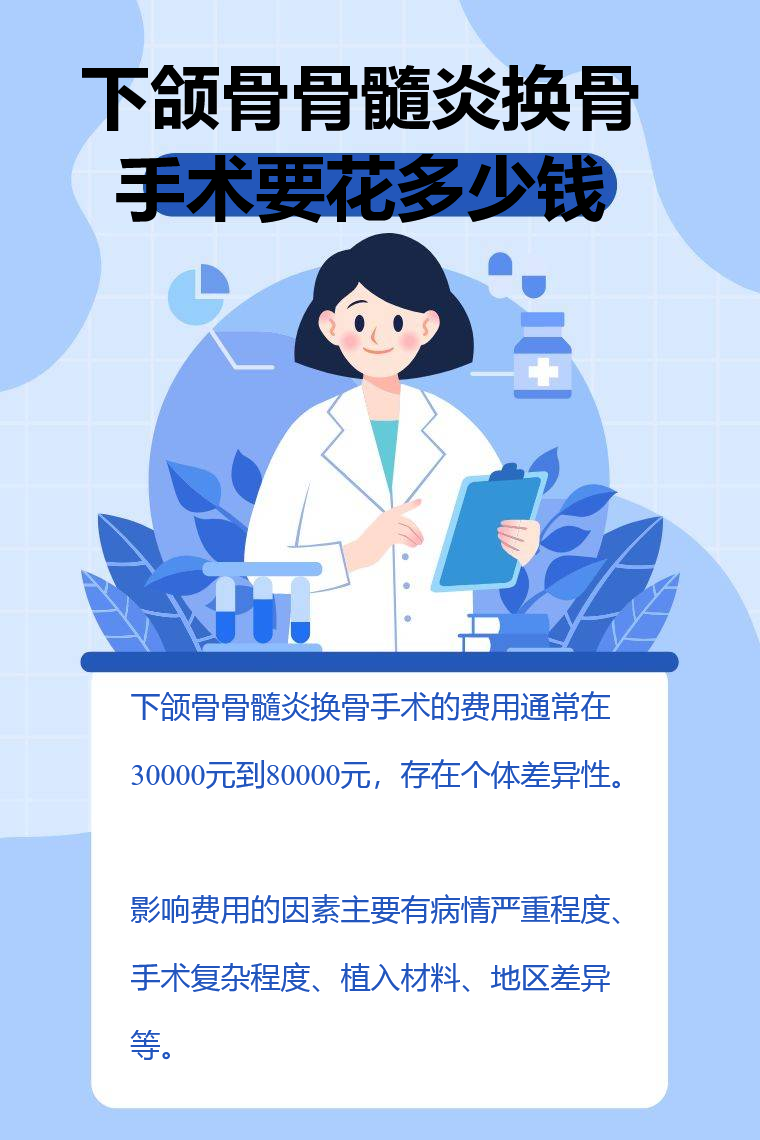 下颌骨骨髓炎换骨手术的费用通常在30000元到80000元,存在个体差异性。影响费用的因素主要有病情严重程度、手术复杂程度、植入材料、地区差异等。