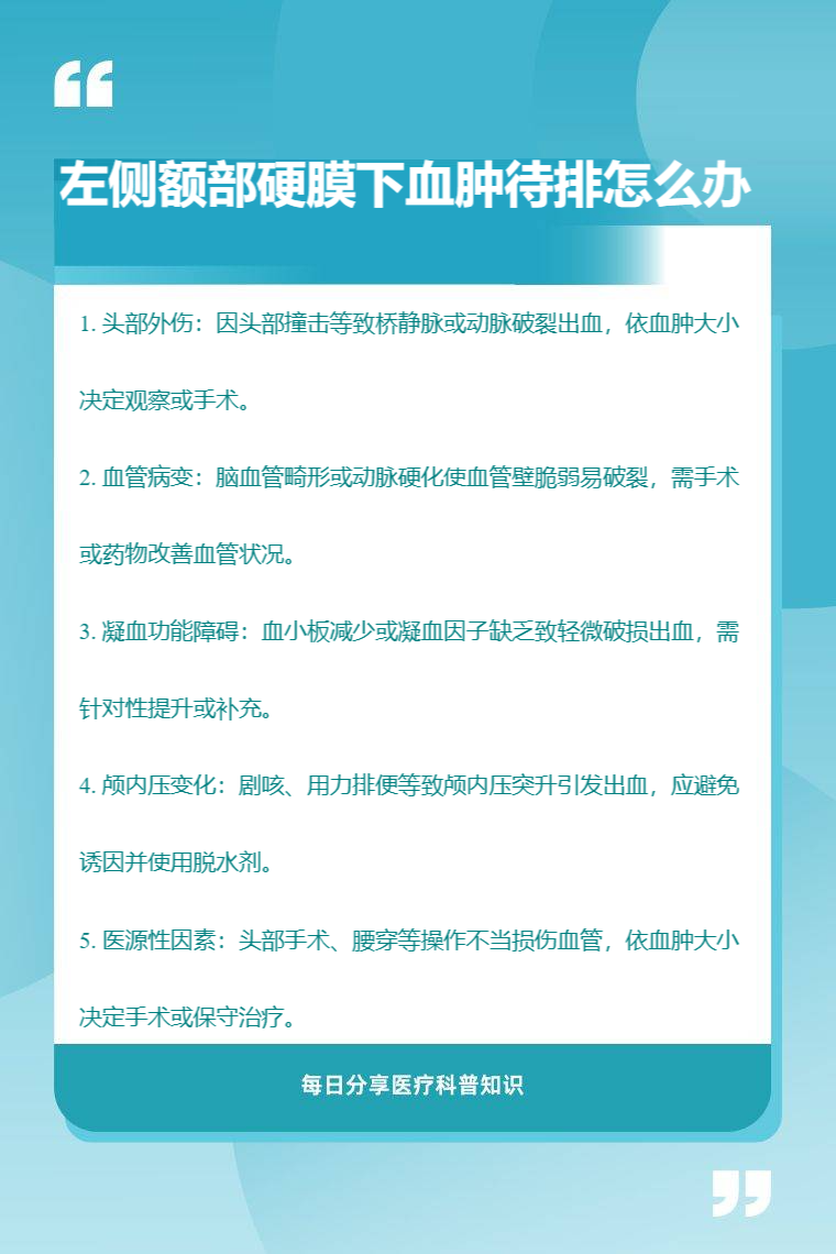 左侧额部硬膜下血肿待排可能是头部外伤、血管病变、凝血功能障碍、颅内压变化、医源性因素等因素,需要针对病因治疗,可采取的方法有手术治疗、药物治疗等。