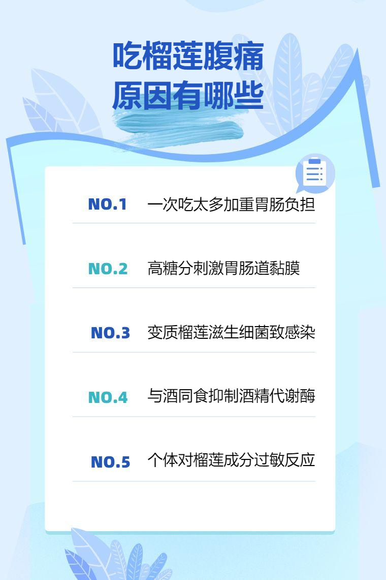 1.一次性食用过量:一次性摄入过多榴莲会加重胃肠消化负担,导致胃肠蠕动异常引发痉挛性腹痛,可适当休息并顺时针按摩腹部促进消化,症状明显时可遵医嘱服用助消化药物。