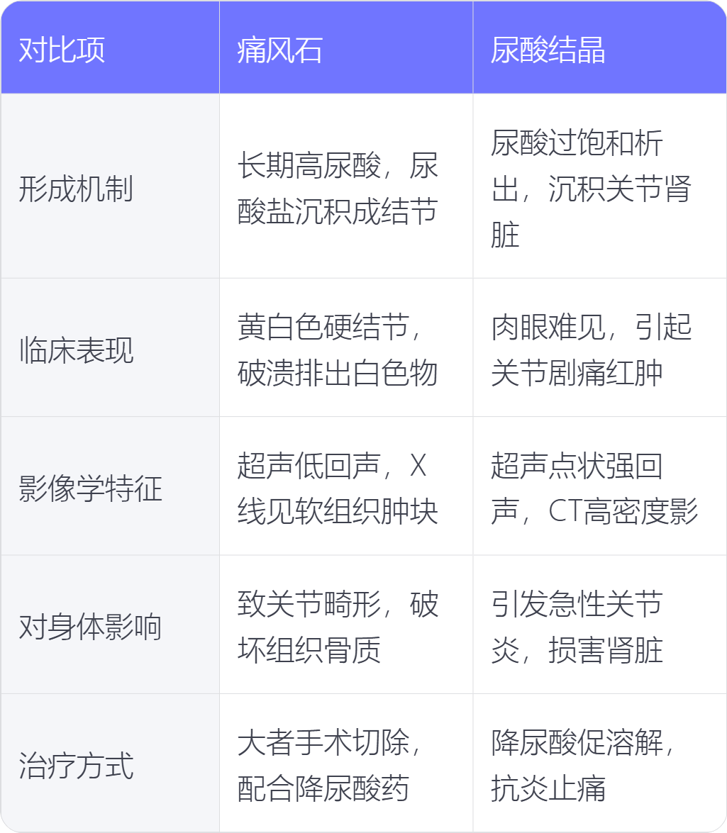 4. 对身体影响:痛风石不仅影响关节功能,导致关节畸形、活动受限,还可破坏周围组织和骨质;尿酸结晶主要引发急性痛风性关节炎,长期存在也可能损害肾脏,引起肾功能不全。