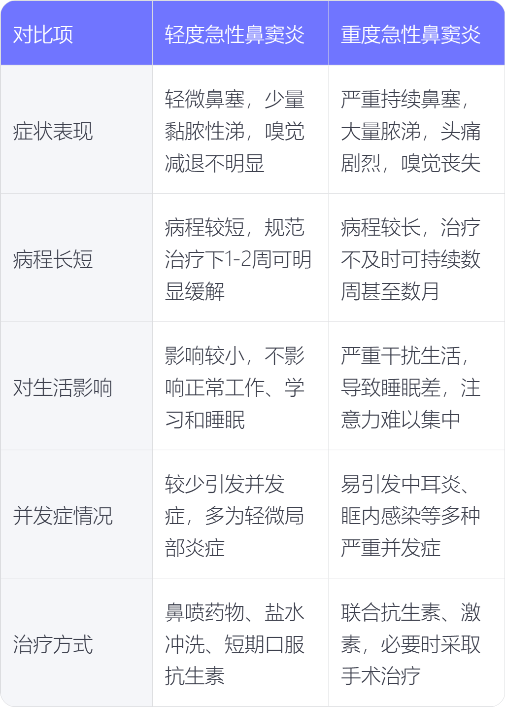 2. 病程长短:轻度急性鼻窦炎病程较短,在规范治疗下,一般1 - 2周症状可得到明显缓解。重度急性鼻窦炎病程较长,若治疗不及时或不规范,症状可能持续数周甚至数月。