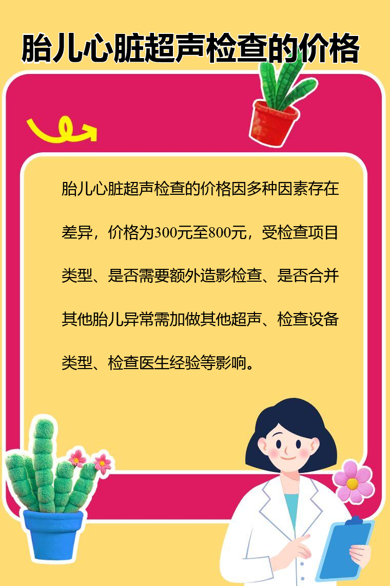 胎儿心脏超声检查的价格因多种因素存在差异,价格为300元至800元,受检查项目类型、是否需要额外造影检查、是否合并其他胎儿异常需加做其他超声、检查设备类型、检查医生经验等影响。