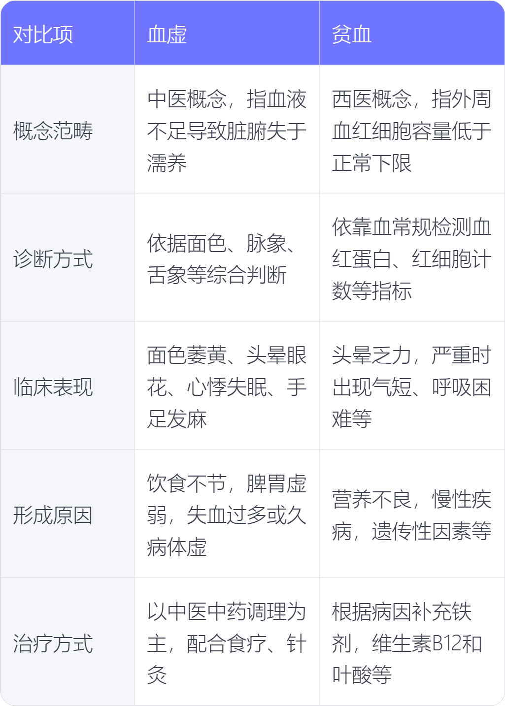 1. 概念范畴:血虚是中医理论概念,是指人体血液不足,导致脏腑、经络等组织器官失于濡养所出现的证候。贫血是西医概念,指人体外周血红细胞容量低于正常范围下限的一种常见综合征。