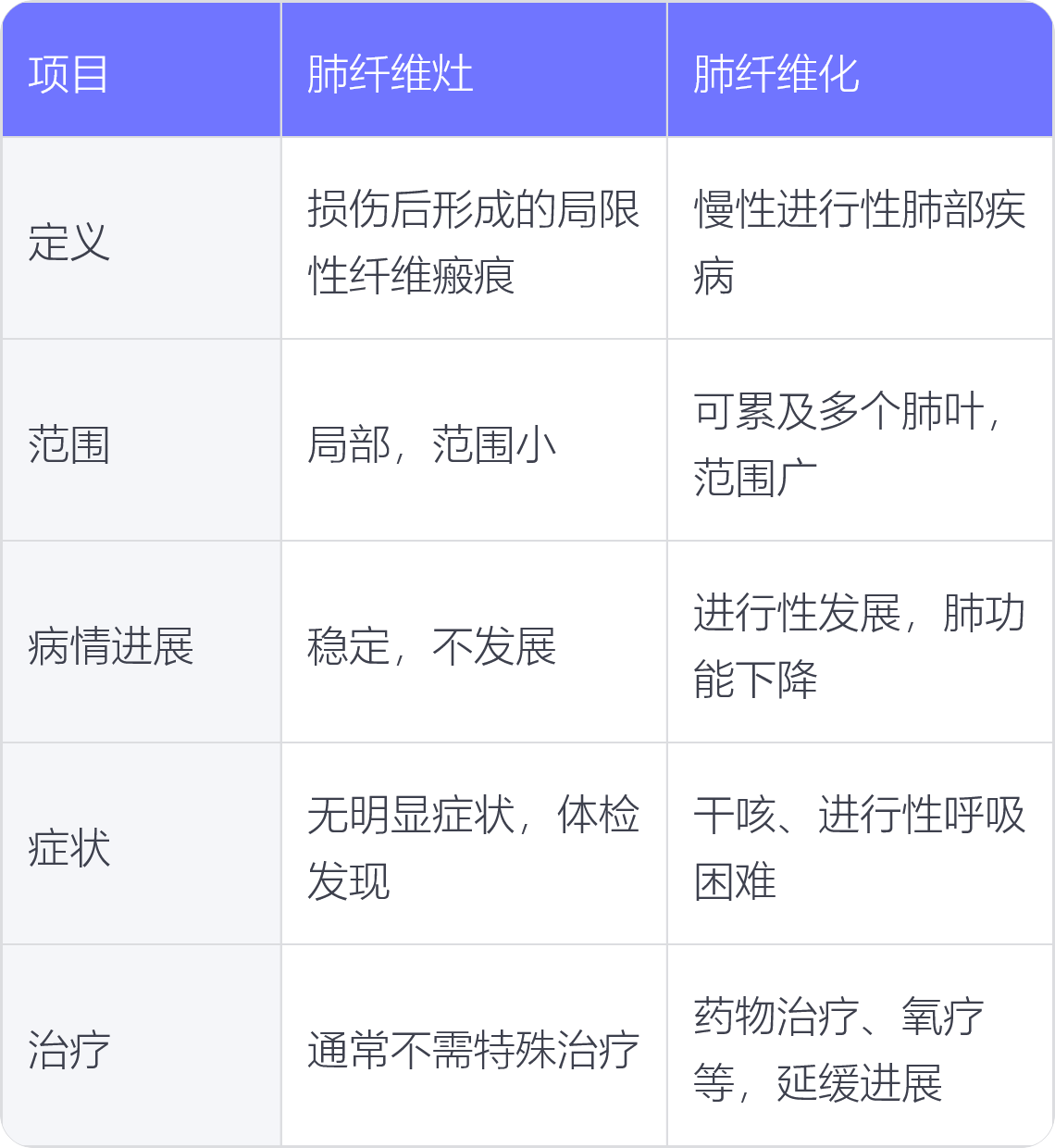 3.病情进展:肺纤维灶一般较为稳定,不会进一步发展;肺纤维化病情呈进行性发展,可导致肺功能逐渐下降。